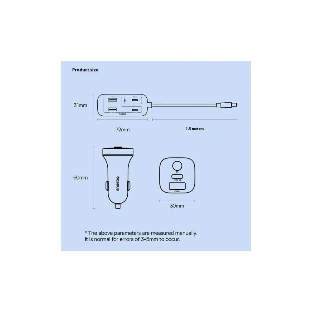 • 1.5m Extension Cord: With the 1.5-meter extension cord, passengers in the backseat can conveniently charge their devices without any hassle, providing flexibility and easy access