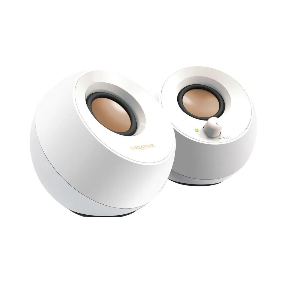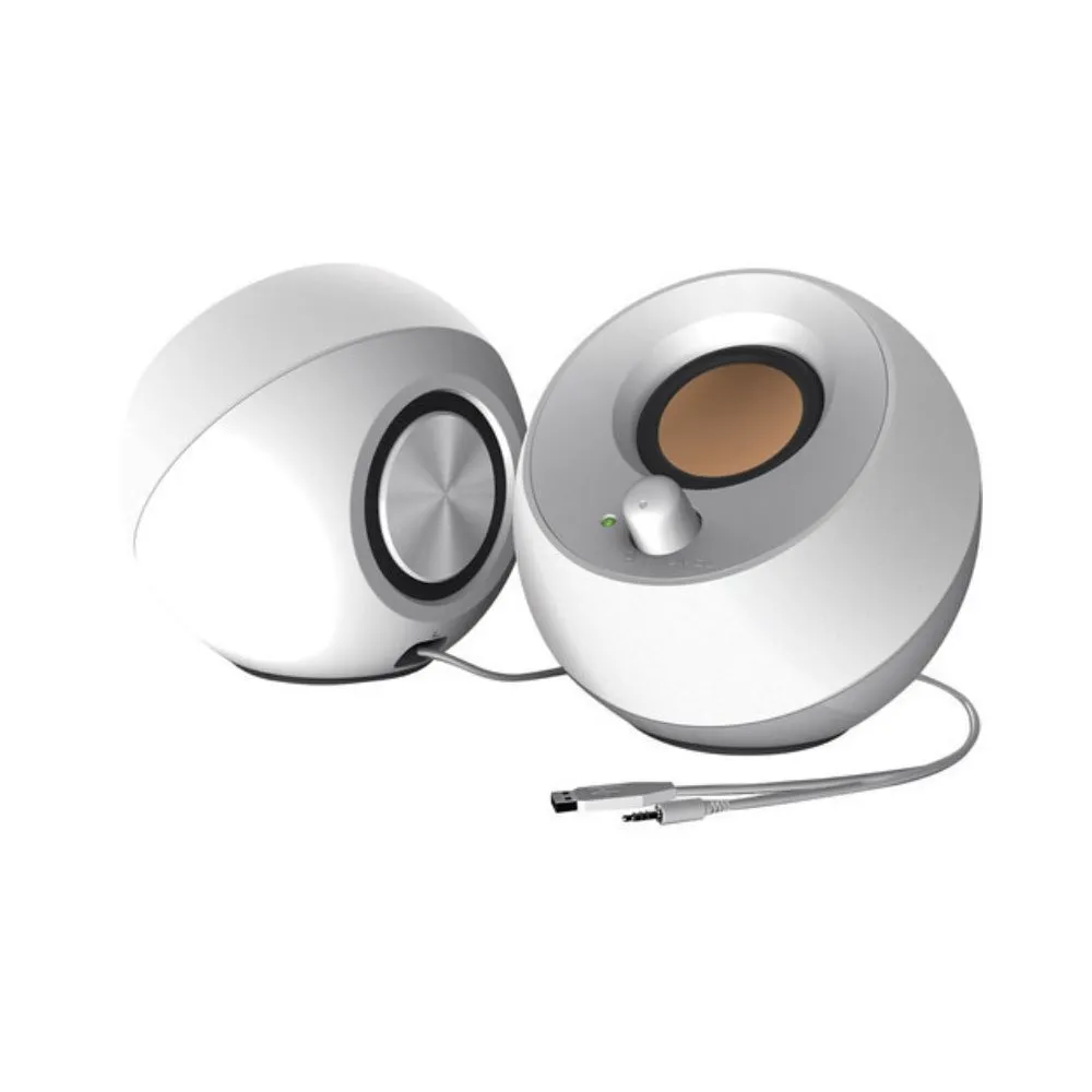 The white Creative Pebble USB 2.0 Desktop Speakers from Creative Labs are designed to be compact and modern, with an orb shape that's inspired by the pebbles found in Japanese rock gardens. Their compact 4.4" width and 45° drivers deliver an elevated sound stage for personalized listening without sacrificing much desk space. Simply connect the USB-powered Creative Pebble to the system of your choice and use the front panel control knob to manage your volume.