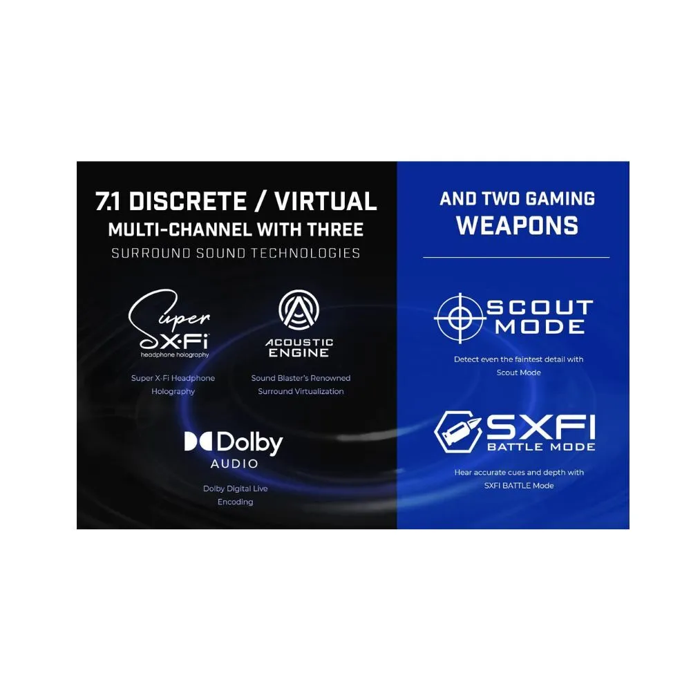 • [SURROUND] Super X-Fi Headphone Holography, Sound Blaster’s renowned Surround Virtualization, Dolby Digital Live, [GAMING] SXFI BATTLE Mode, Scout Mode