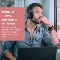 - MADE FOR TRAVEL, DESIGNED FOR COMFORT – There are three ways to store – flat folded, half folded and compactly folded – portable to store in your laptop carry bag or carry on luggage on the plane. It has a reinforced steel inner core that forms the backbone of the headphones with optimal acoustic seal and is made of particularly soft faux leather that sits comfortably even after long listening hours