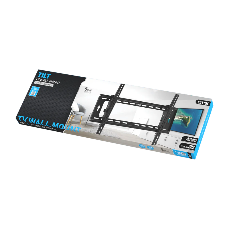 Our Crest Tilt Action TV Wall Mount combines high-grade steel durability with a sleek, contemporary design. Engineered for strength and versatility, this mount is designed to fit universally and is compatible with a wide range of medium to large-format TV models on the market. Securely mount your 37" to 90" flat-screen TV with this sturdy tilt-action mount, supporting panels up to 80kg. The adjustable design features a ±10° tilt to effectively reduce screen glare and reflections, ensuring you achieve the optimum viewing angle for a comfortable, clutter-free entertainment experience.