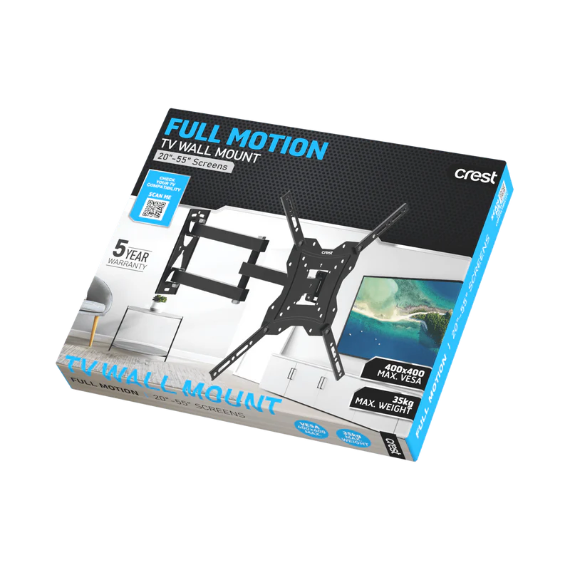 Our Crest Full Motion TV Wall Mount offers a sleek, contemporary solution for versatile viewing. Engineered from high-grade steel, this mount is designed to fit universally and is compatible with a wide range of TV models on the market. Securely mount your 20" to 55" flat-screen TV with this full-motion wall mount, supporting panels up to 35kg. The adjustable design features a +5° to -10° tilt to reduce glare and a wide ±90° pan, allowing you to position your screen for the perfect angle in any seating position or open-plan space.