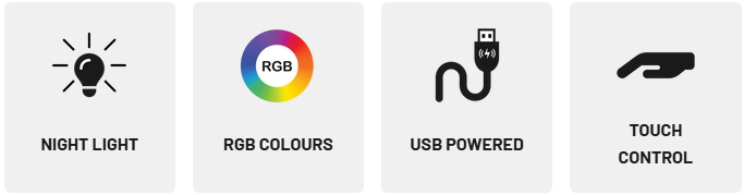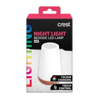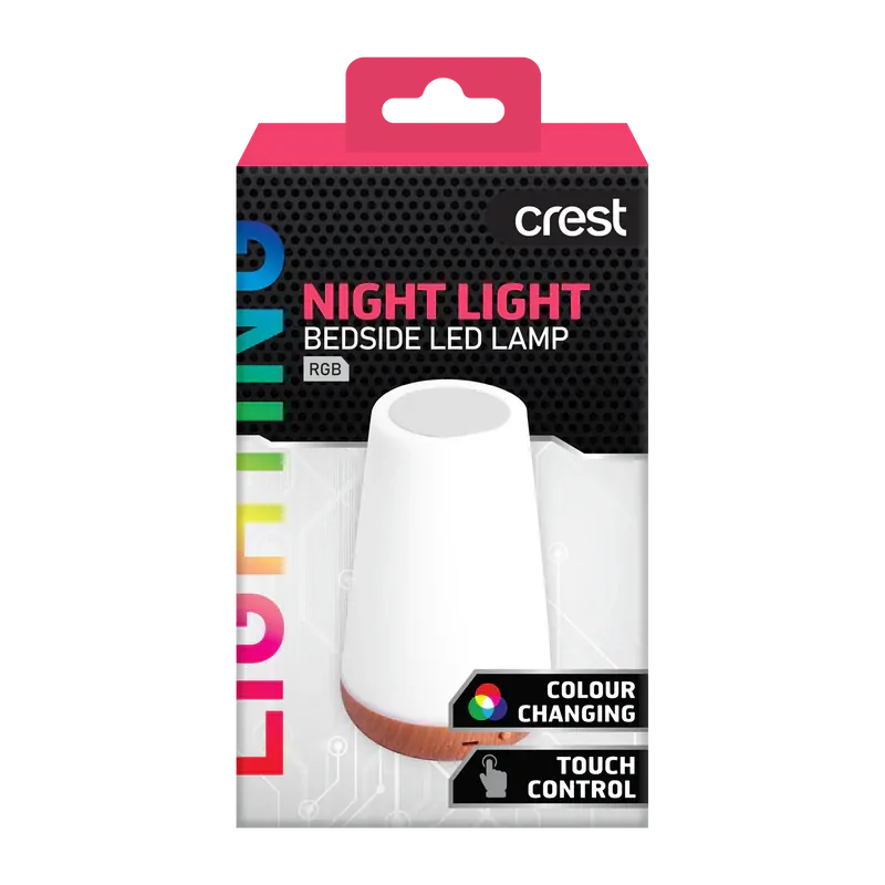 The Crest RGB Bedside Lamp is ideal for bedrooms and living areas, this bedside lamp features multiple colours with touch control for convenience. Powered by USB cable for easy use. (WALL CHARGER NOT INCLUDED)