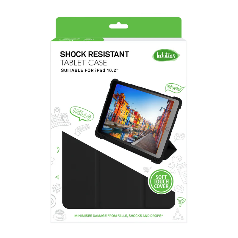 This TechXtras Shock-Resistant Tablet Case is the perfect match for your 7th and 8th Gen iPad 10.2”. This case is engineered to minimise damage from scratches, bumps and shocks using its tough exterior shell. It features a soft-touch rubber tri-fold stand to protect your screen and fold to set up the tablet to view from multiple angles. Inside is a stylus holder and precision cut holes for the ports and camera. The power button is covered to protect from dust. On the back is a tough clear window to showcase the tablet brand and colour of your tablet.