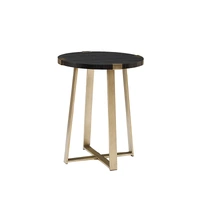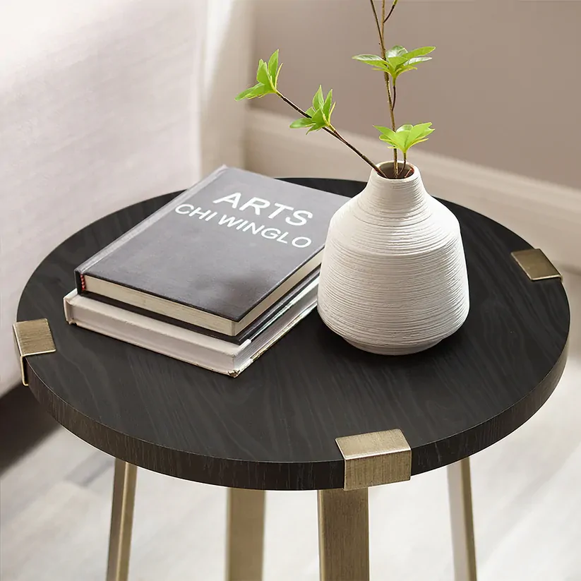 This Criterion Capri End Table is a sophisticated, modern statement piece for any living space. The round table top is supported by a gold metal leg frame, and features metal edge highlights for an elegant touch. Finished in black oak, it's a timeless, classic design that is sure to last. Enjoy peace of mind with a 12 month warranty.