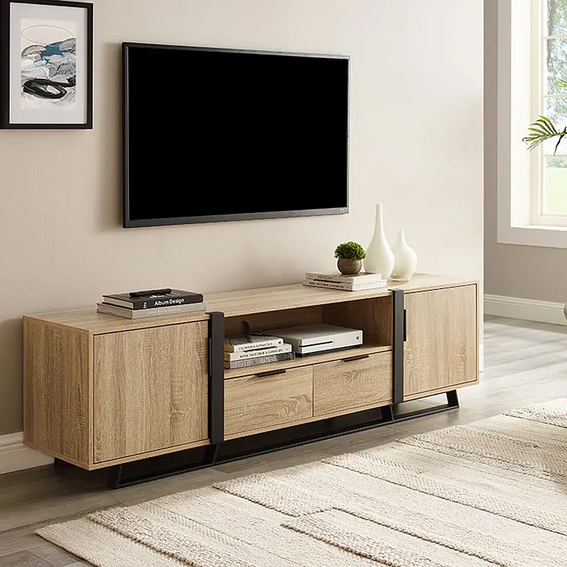 The Criterion Capri Entertainment Center is a stylish and functional piece of furniture. Offering one component space or sound bar space, cable management, two drawer fronts with metal handles, and ball bearing drawer runners, it makes managing and storing your entertainment accessories simple and hassle-free. With its oak cabinet, black metal frame and highlight panels, it brings a luxurious touch to any living or entertainment area.
