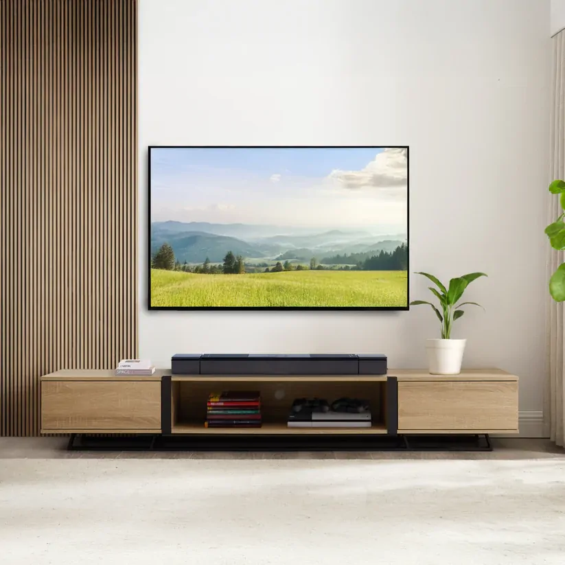 The Criterion Capri Entertainment Center is a stylish and functional piece of furniture. Offering one component space or sound bar space, cable management, two drawers with push to open ball bearing drawer runners, it makes managing and storing your entertainment accessories simple and hassle-free. With its oak cabinet, black metal frame and highlight panels, it brings a luxurious touch to any living or entertainment area.