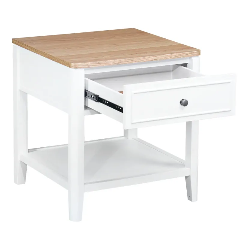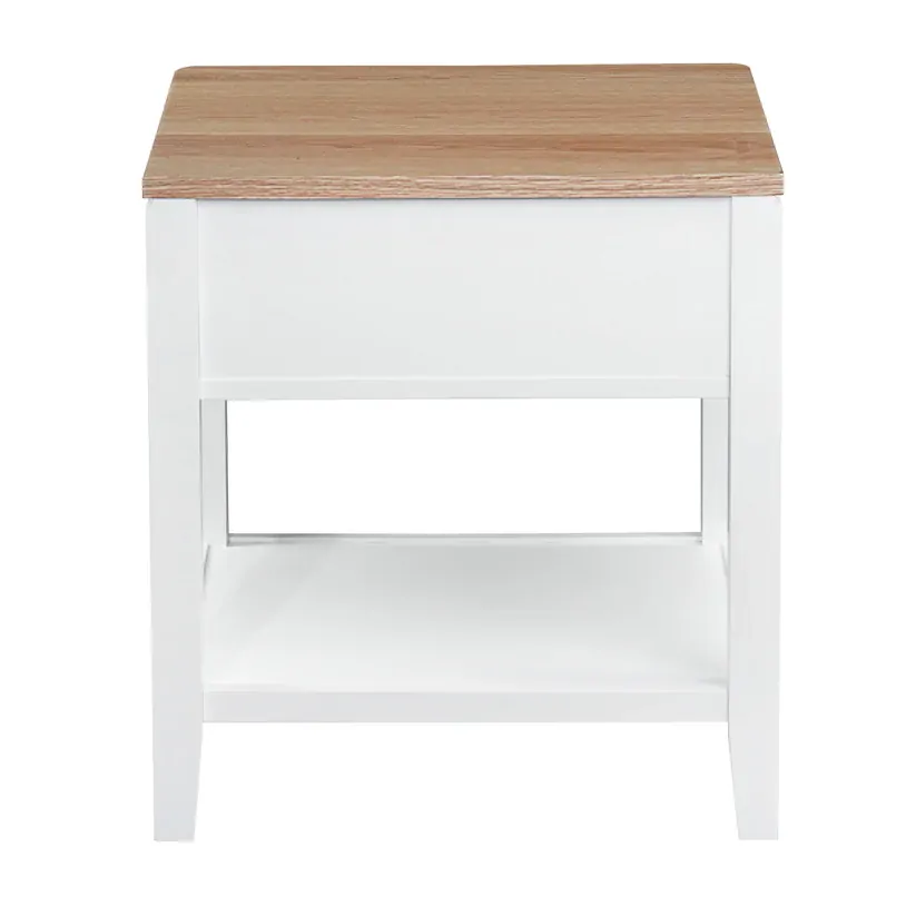 Elevate your living space with our Criterion Sorrento End Table. Crafted with real white oak wood veneer and a natural finish top, this semi-assembled table exudes luxury and sophistication. Its one drawer and bottom storage shelf provide convenient storage, while the solid MDF construction and KD Hevea wood legs ensure durability. Comes with a 12-month warranty.