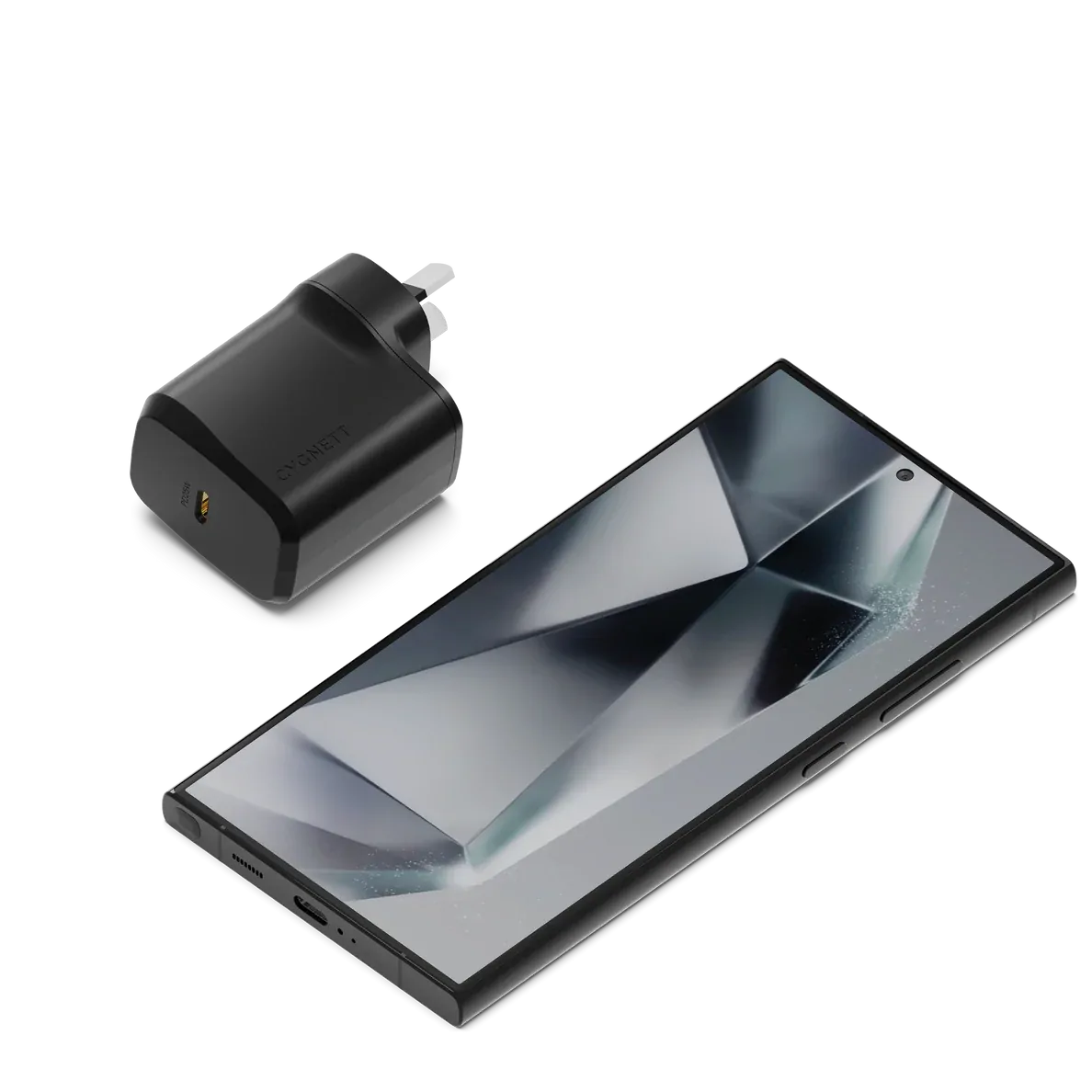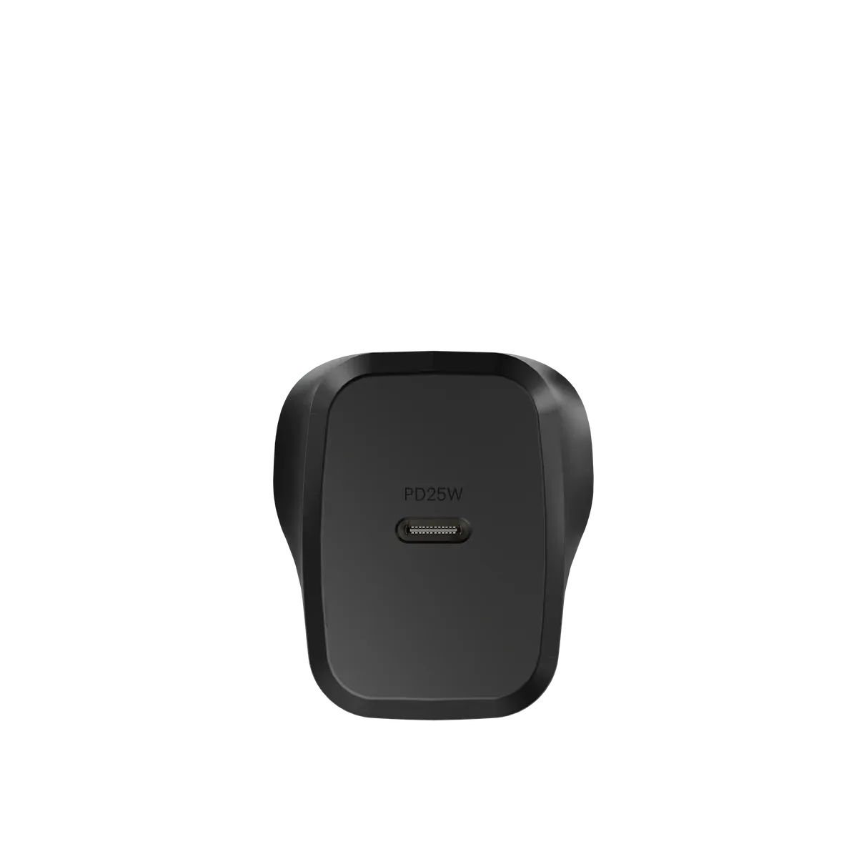 The Cygnett 25W GaN USB-C Wall Charger delivers up to 25 W output via USB-C Power Delivery (PD) and PPS technology, supporting profiles of 5 V = 3.0 A (15 W), 9 V = 2.77 A (25 W), 12 V = 2.08 A (25 W max) with total output up to 25 W. It accepts 100–240 V ~ 50/60 Hz input and uses gallium nitride (GaN) technology for a compact, travel-friendly design. The unit comes in black, model number CY4735PDWCH, is designed in Australia, and includes a 2-year warranty.