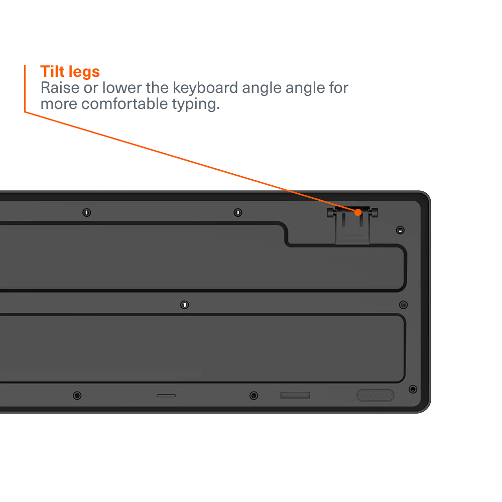 • Tilt legs: Raise or lower the keyboard angle to type in comfort for longer sessions.