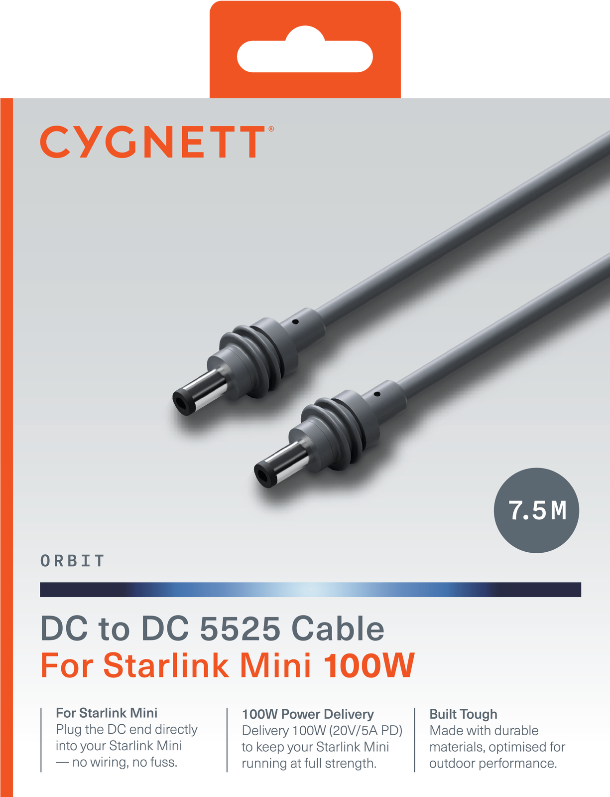 7.5M Output: DC: 20.0V=5.0A (100W), Total Output: 100W, Input: DC: 20.0V=5.0A (100W) Product dimensions: 119mm H x 77mm W x 20mm D Product Weight: 229g Packaging dimensions: 154mm H x 107mm W x 31mm D Packaging weight: 131g Product barcode: 0848116053820 What’s in the box: Orbit DC to DC 5525 7.5M Cable for Starlink Mini 100W, Warranty Card |