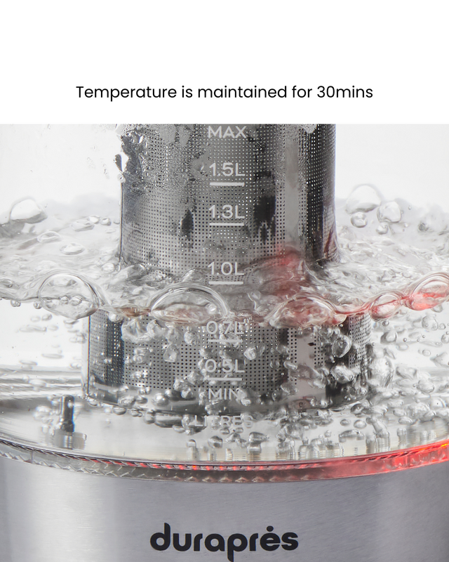 • Safety features: Boil-dry protection, auto shut-off, visual indicator