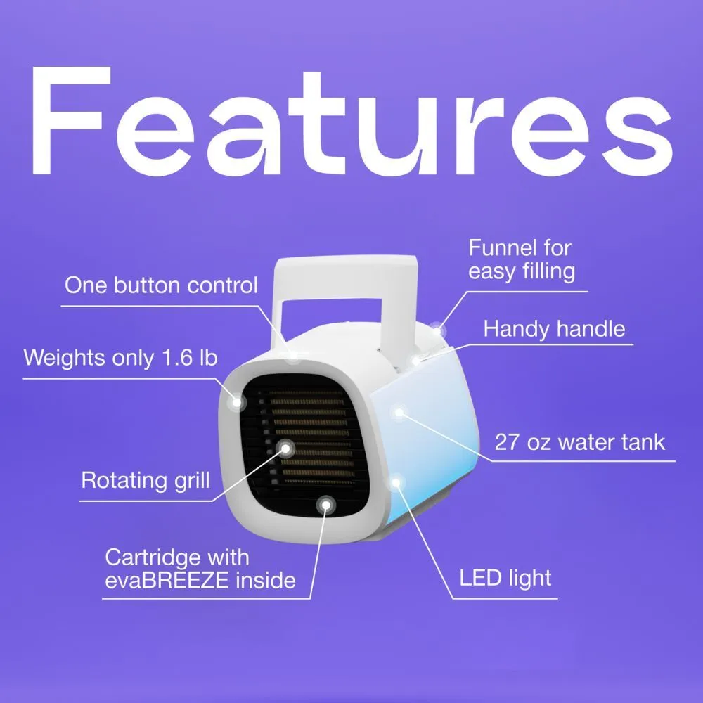 evaCHILL air cooler was created to cool down exclusively the personal area only in front of you. It does not waste tons of energy to cool down the whole room. Powered by unique evaBREEZE technology, the evaCHILL air cooler can achieve a cooling effect up to 44.6-50 °F degrees (7-10 °C) depending on the humidity level.