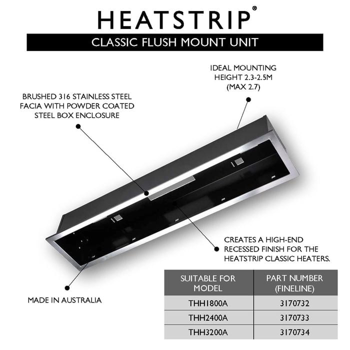 The Heatstrip® Flush Mount Kit is a stainless steel enclosure that is ideal for neatly installing Heatstrip into a ceiling. Designed for use with the Heatstrip Classic heater, the Flush Mount Kit features durable 316 grade stainless steel fascia, a black zinc coated steel casing and is supplied with brackets to hold the Heatstrip heater in place. A minimum 50mm of clearance is required above the enclosure within the ceiling to allow for air circulation.