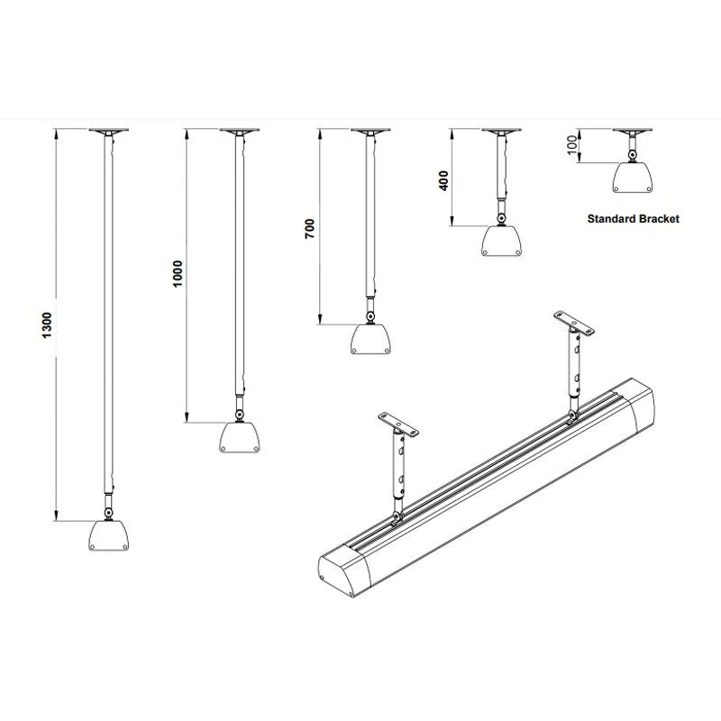 The Extension Mount bracket allows HEATSTRIP® Intense units to be lowered from high ceilings using rigid connections. The standard length options as part of the kit are 300mm, 600mm, 900mm, and 1200mm. The extension mount bracket utilizes components from the standard bracket kit which is supplied with each heater. Replacement standard THY brackets (2 in pack).