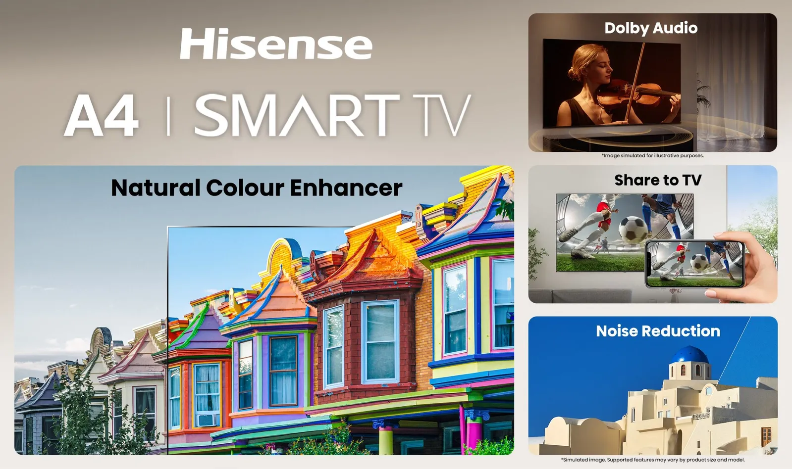The Hisense A4 Smart TV is designed to make everyday entertainment easy and enjoyable, bringing together natural colour, immersive sound and simple sharing for a better way to watch at home.