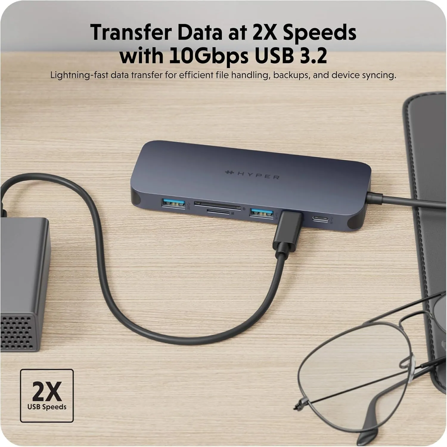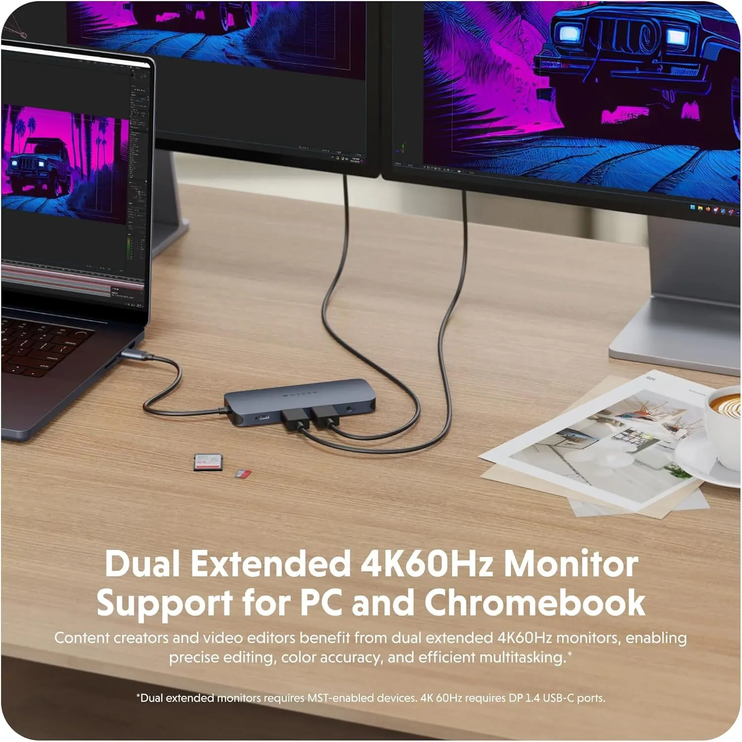 - Dual Extended 4K60Hz Monitor Support for PC and Chromebook*: Enhance your productivity and multitasking capabilities with Hyper's travel accessories. By providing a spacious and immersive workspace, allowing users to simultaneously view and work on multiple high-resolution content, such as videos, images, documents, and applications, with smooth and crisp visuals. *Dual extended monitors require MST-enabled devices. 4K 60Hz requires DP 1.4 USB-C ports.