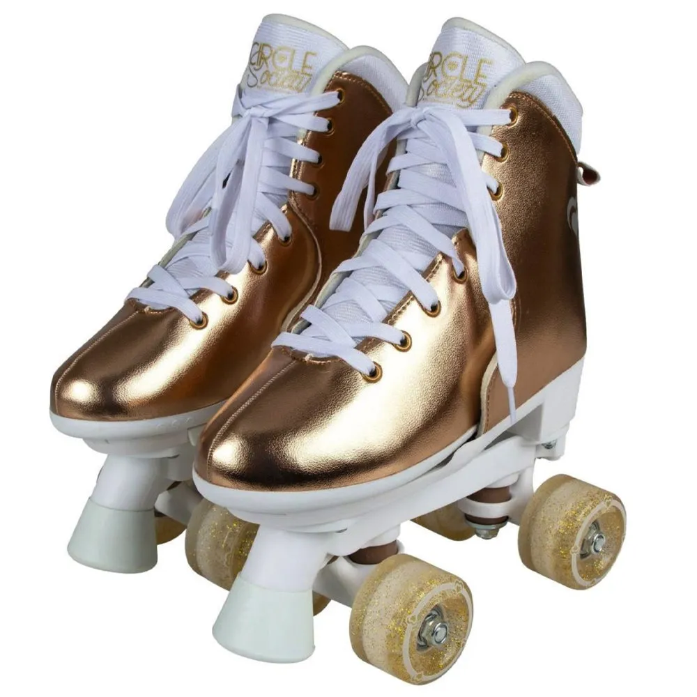 Bravo Sports Circle Society Metallic Rose Gold Roller Skates Size 3-7 - Skate through the streets with great flair, sporting Circle Society's Adjustable Roller Skates! Featuring a vibrant design and smooth-rolling polyurethane wheels, these skates are perfect for indoor and outdoor adventures. With an easy-push button for adjustable sizing (US sizes 3-7) and ABEC 7 sealed bearings, youll be grooving down the rink with a snug fit and reliable performance. Plus, dual front brakes ensure safety and control during every ride. So whatre you waiting for? Strap on and let the good times roll!