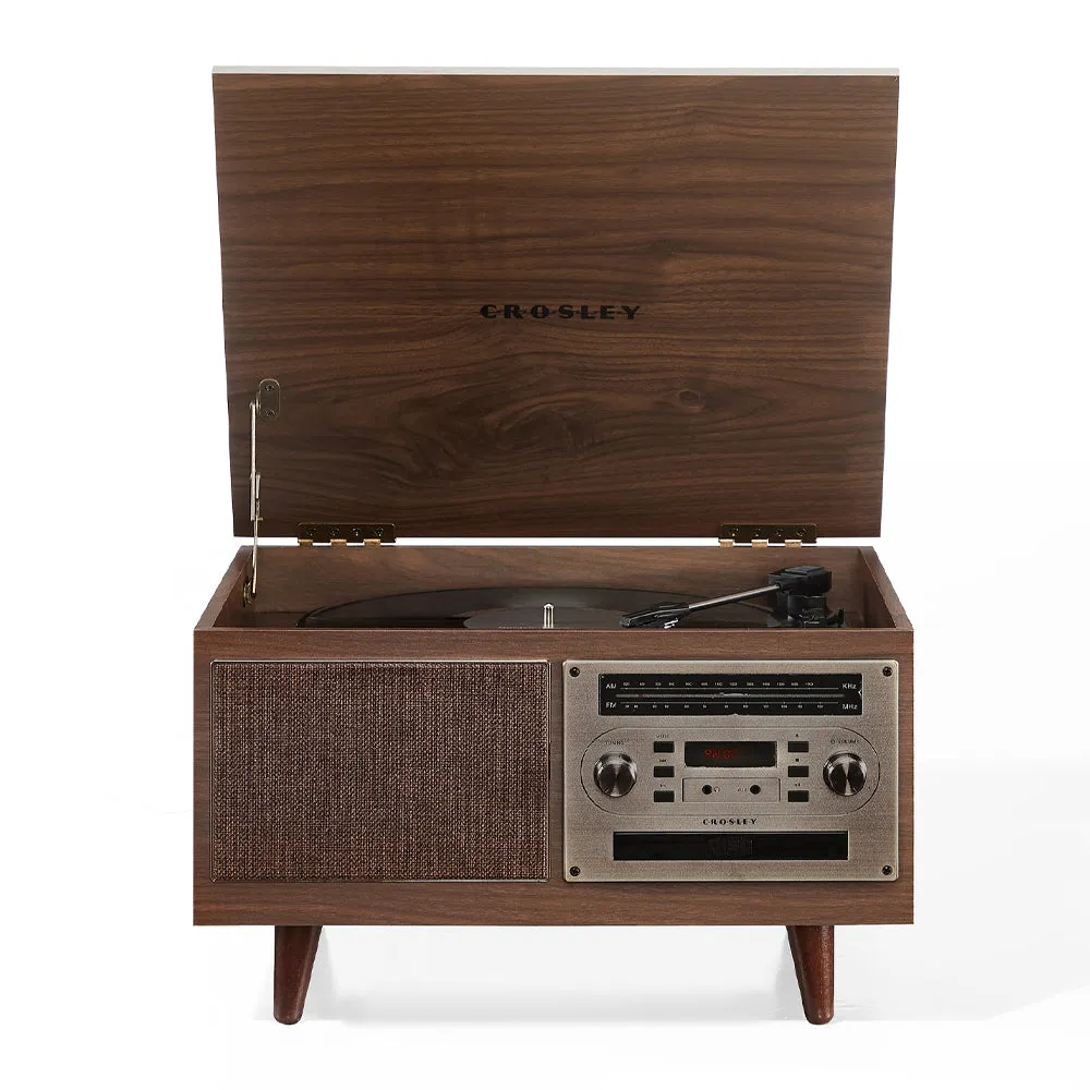 The Crosley Serenade 8-in-1 Record Player brings together all your favourite ways to listen to music in one sleek, retro-inspired package. Play vinyl records, cassettes, CDs, and AM/FM radio, or stream your digital playlists via Bluetooth. Designed with removable tapered legs and elegant gold accents, this entertainment centre adds a touch of mid-century modern charm to any space.