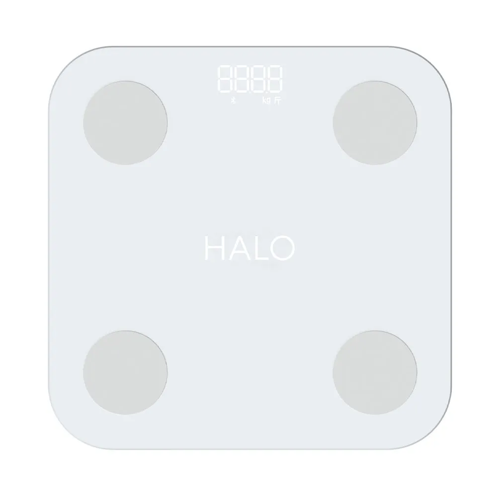 HALO Bluetooth Smart Body Scale- Bluetooth smart scale with white LED display and 13 body metrics including BMI, BMR, body fat, muscle mass, protein, and more. Connects to fitness app.