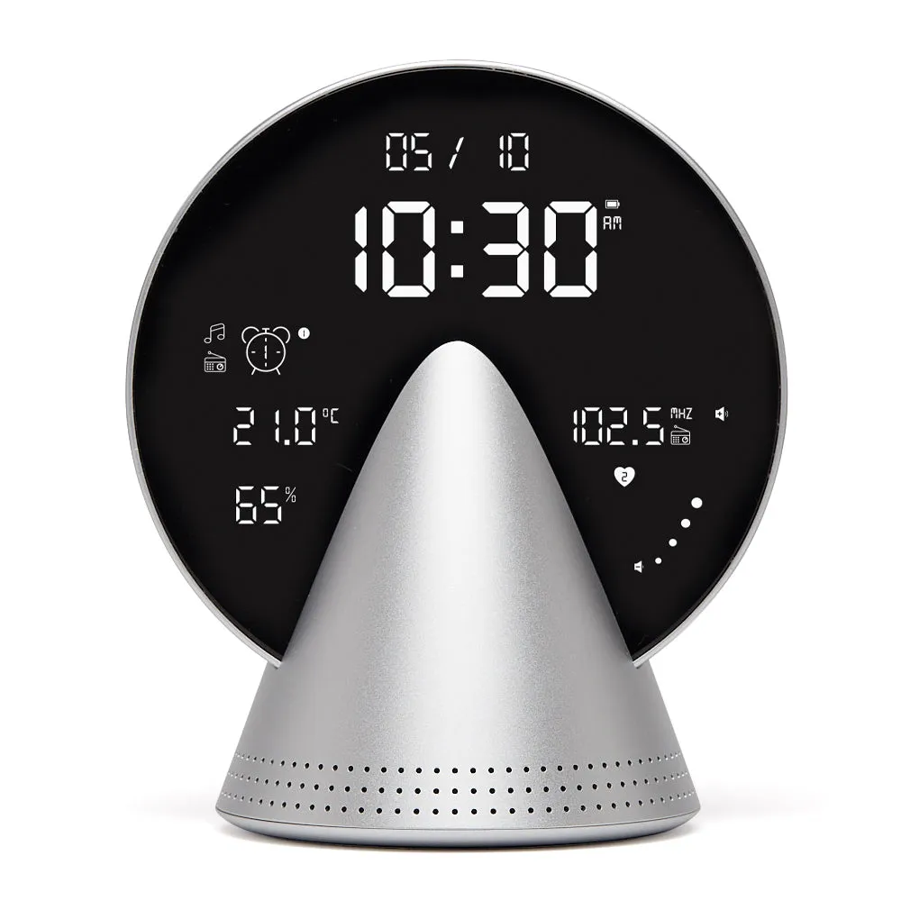Lexon Conic Radio Alarm Clock With Fm & Built-In Bluetooth Speaker - Alu Polish - This versatile radio alarm clock features an FM radio and a built-in Bluetooth speaker, allowing you to wake up to your favourite FM station, soothing melodies, or natural sounds. It boasts a large LCD display with adjustable brightness for optimal visibility and includes an indoor temperature and relative humidity display for added convenience. The touch controls provide easy access to Bluetooth and FM radio modes, as well as device settings. Rechargeable and powered by a USB-C cable (included), this clock is crafted from durable aluminium and ABS materials. It is suitable for branding through laser or pad printing.