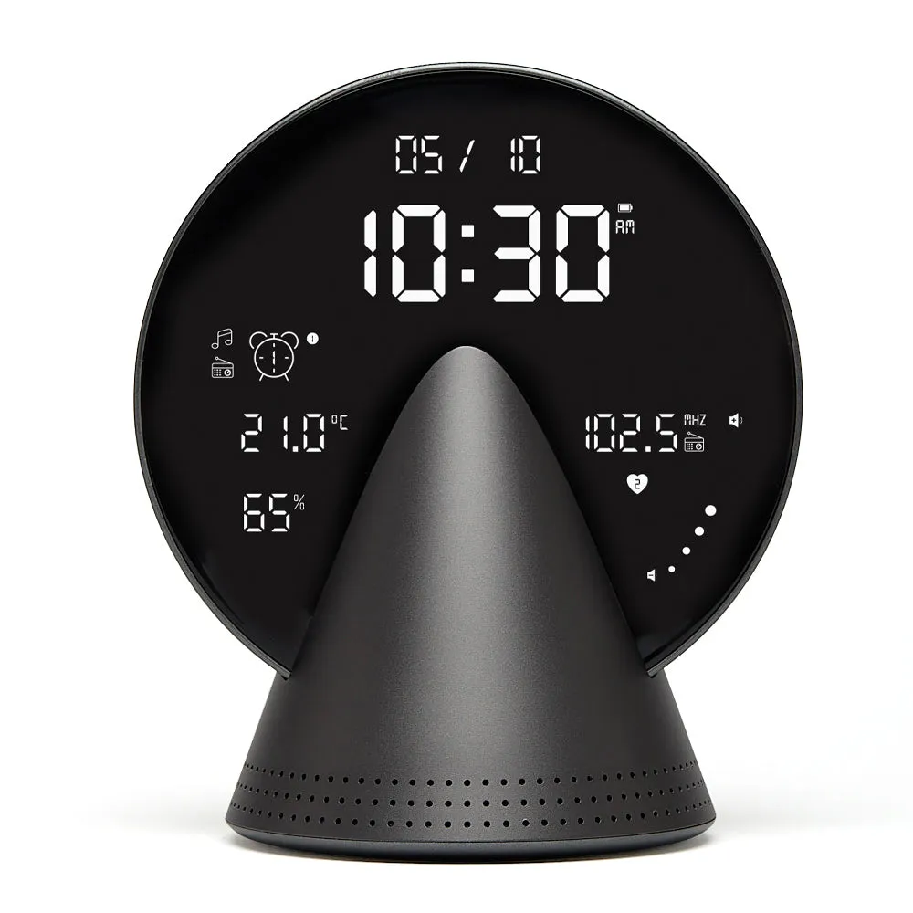 Lexon Conic Radio Alarm Clock With Fm & Built-In Bluetooth Speaker - Grey - This versatile radio alarm clock features an FM radio and a built-in Bluetooth speaker, allowing you to wake up to your favourite FM station, soothing melodies, or natural sounds. It boasts a large LCD display with adjustable brightness for optimal visibility and includes an indoor temperature and relative humidity display for added convenience. The touch controls provide easy access to Bluetooth and FM radio modes, as well as device settings. Rechargeable and powered by a USB-C cable (included), this clock is crafted from durable aluminium and ABS materials. It is suitable for branding through laser or pad printing.