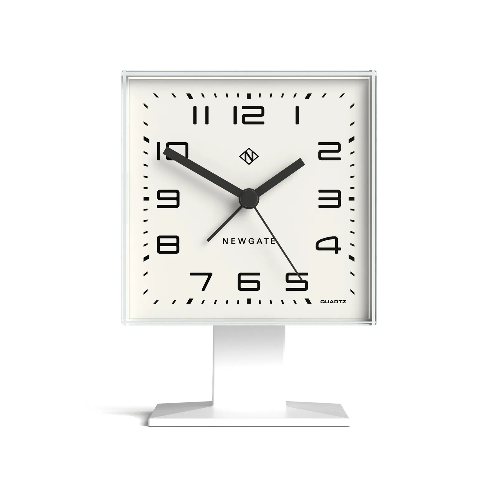 Newgate Victor Alarm Clock Pebble White An acrylic modern retro-inspired alarm clock with an Arabic dial and deep acrylic lens. The square case has a matt finish and sits on a square podium, making this unique Newgate-designed alarm clock a great addition to your desk, shelf or bedside.