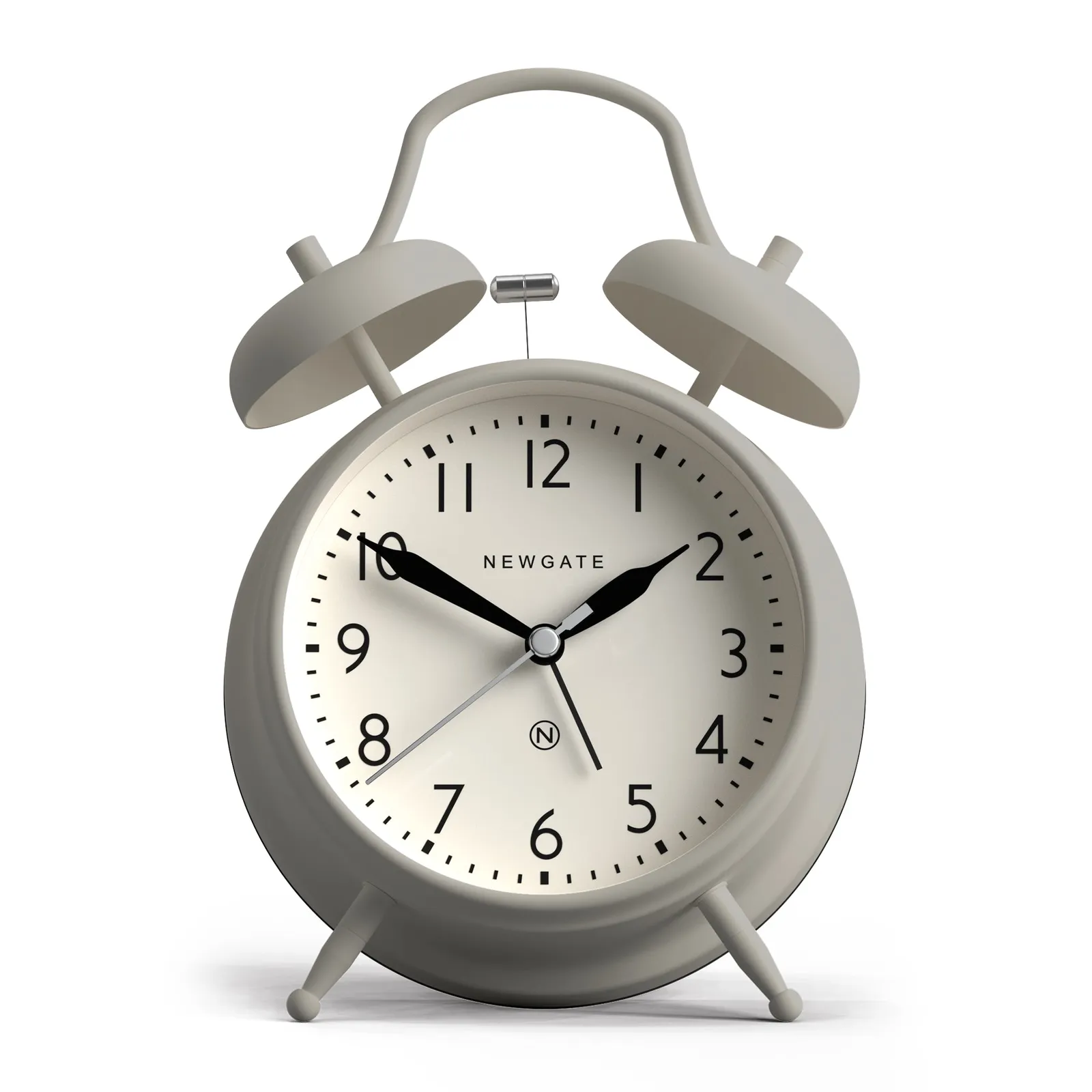 Newgate New Covent Garden Alarm Overcoat Grey Our iconic twin-bell alarm clock in classic 'Overcoat' grey. This large metal alarm clock has a contemporary dial and real moving hammer-and-bell action for a traditional wake-me-up.