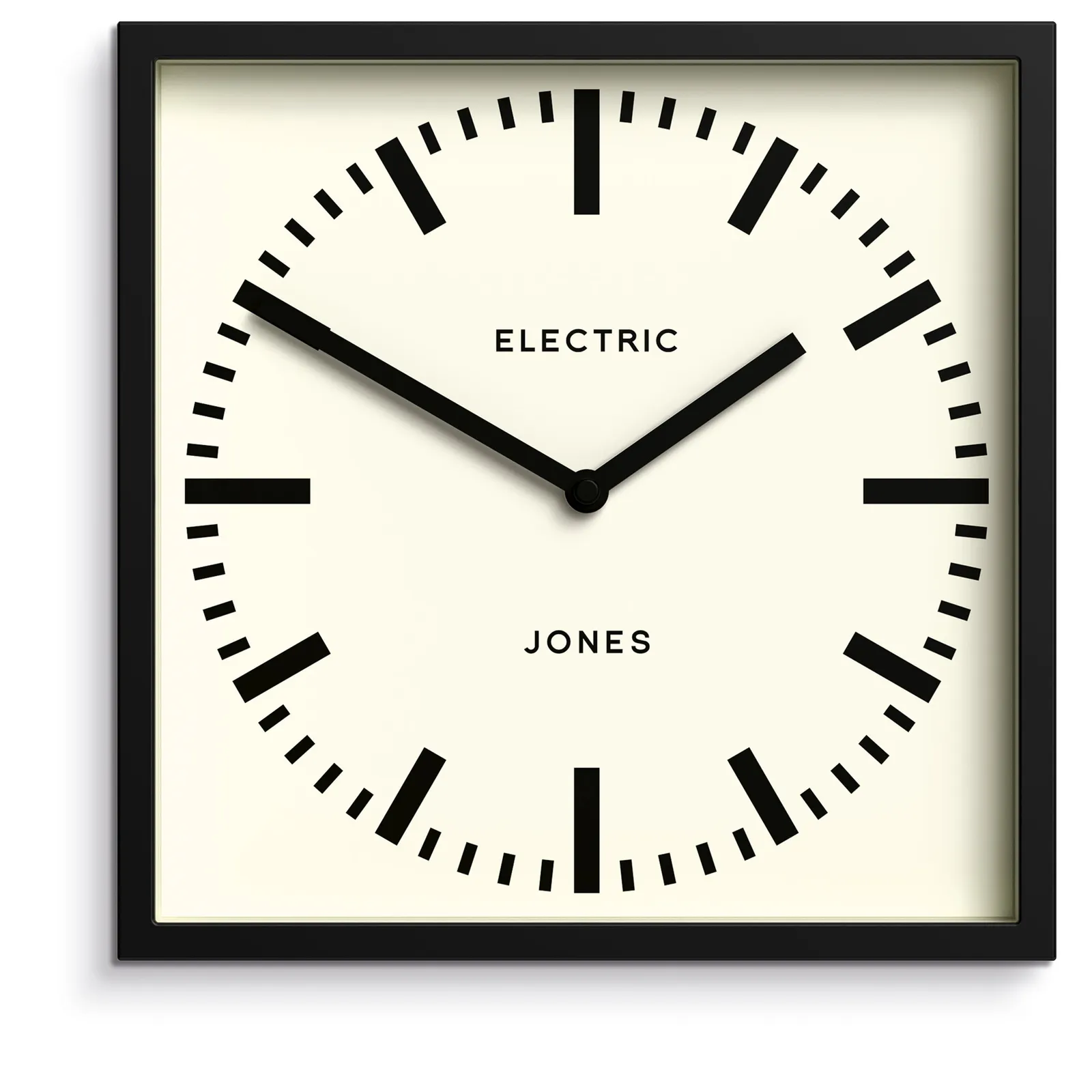 Newgate Jones Box Wall Clock Black A square wall clock with a round railway dial and contemporary black case. The railway dial is complimented, by minimalistic straight hands, a straight-cut case and a glass lens.