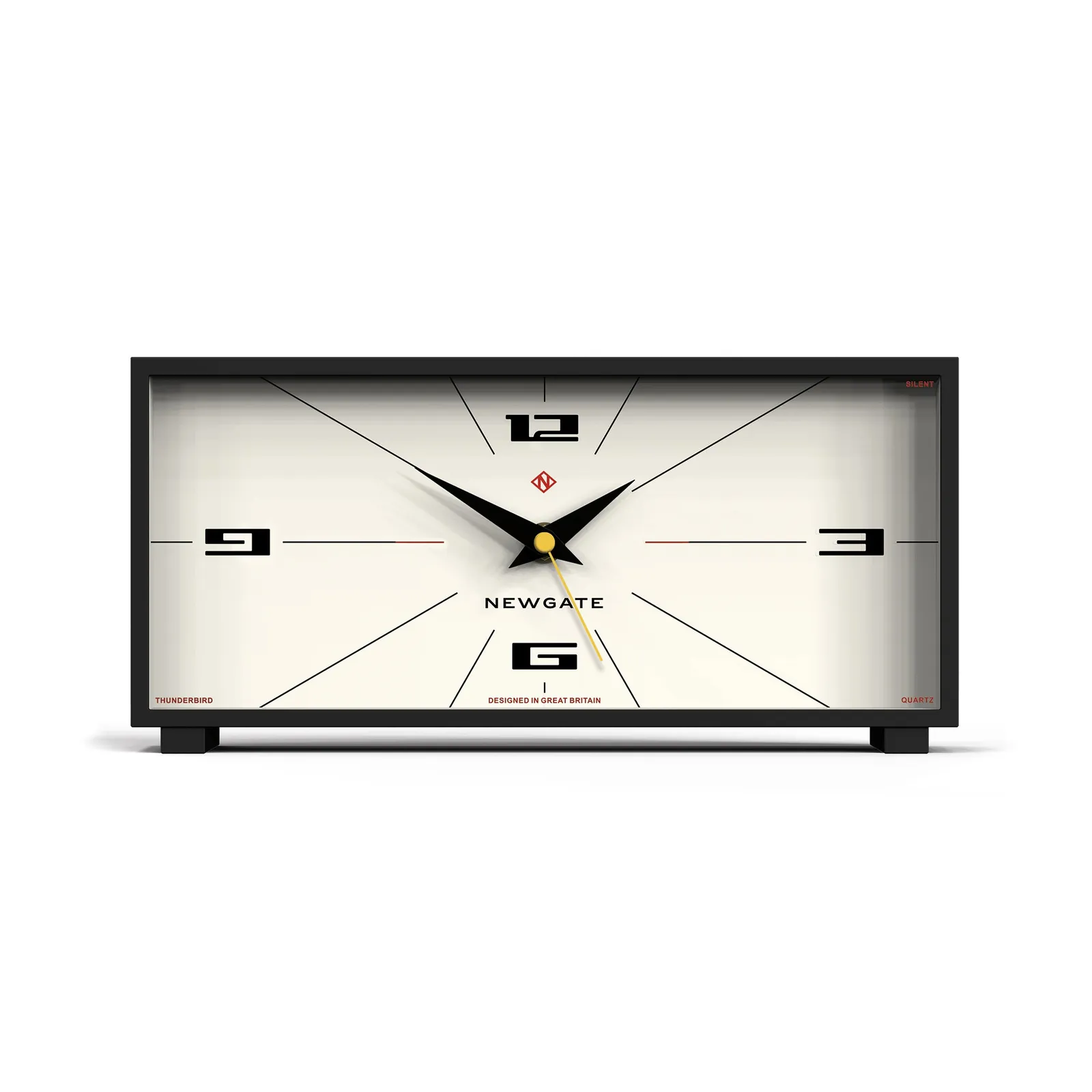 Newgate Thunderbird Mantel Clock Neutral Rocket Dial A mid-century modern mantel clock with an emphasis on the modern. This space-age design blends a contemporary cream face and matt black silicone case with a retro-inspired dial and simplified numerals.