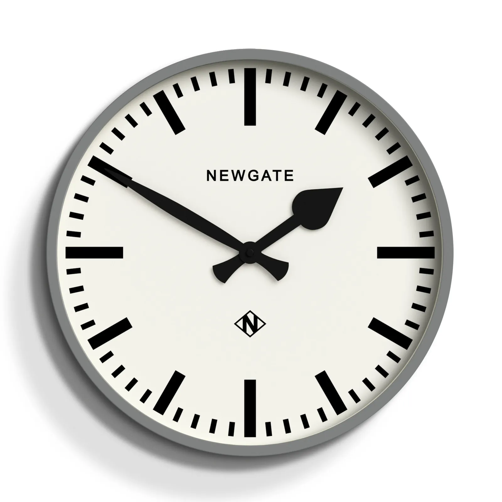 Newgate Railway Clock Grey A neutral grey station wall clock with a bold marker dial, black spade and batton hands and a minimalist straight-cut case.