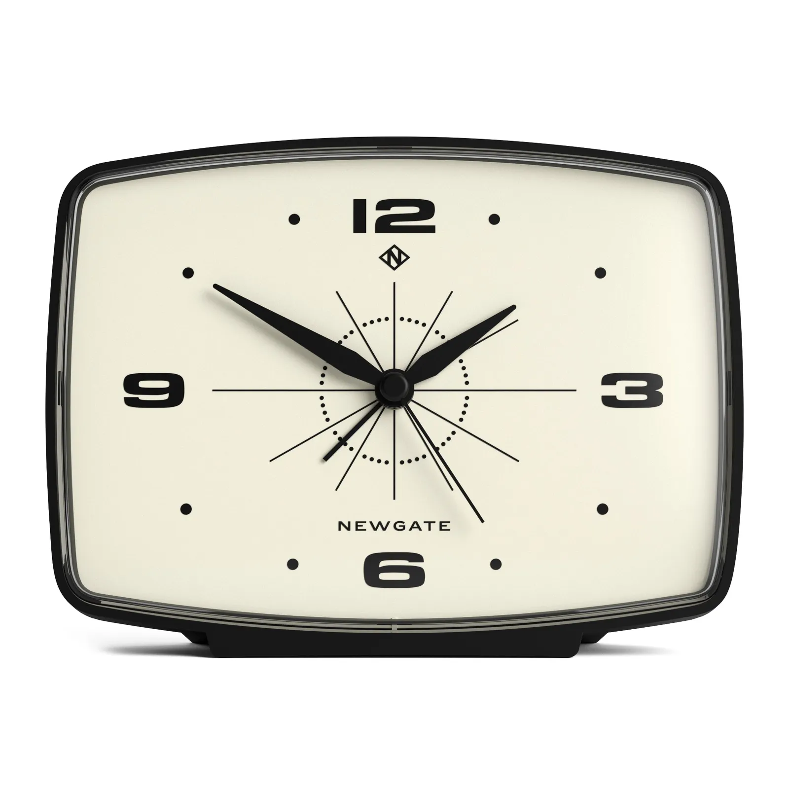 Newgate Brooklyn Alarm Clock Black. A small retro-inspired alarm clock with a rectangular black case sat on a small acrylic stand, making this unique Newgate designed alarm clock a great addition to your desk, shelf or bedside.
