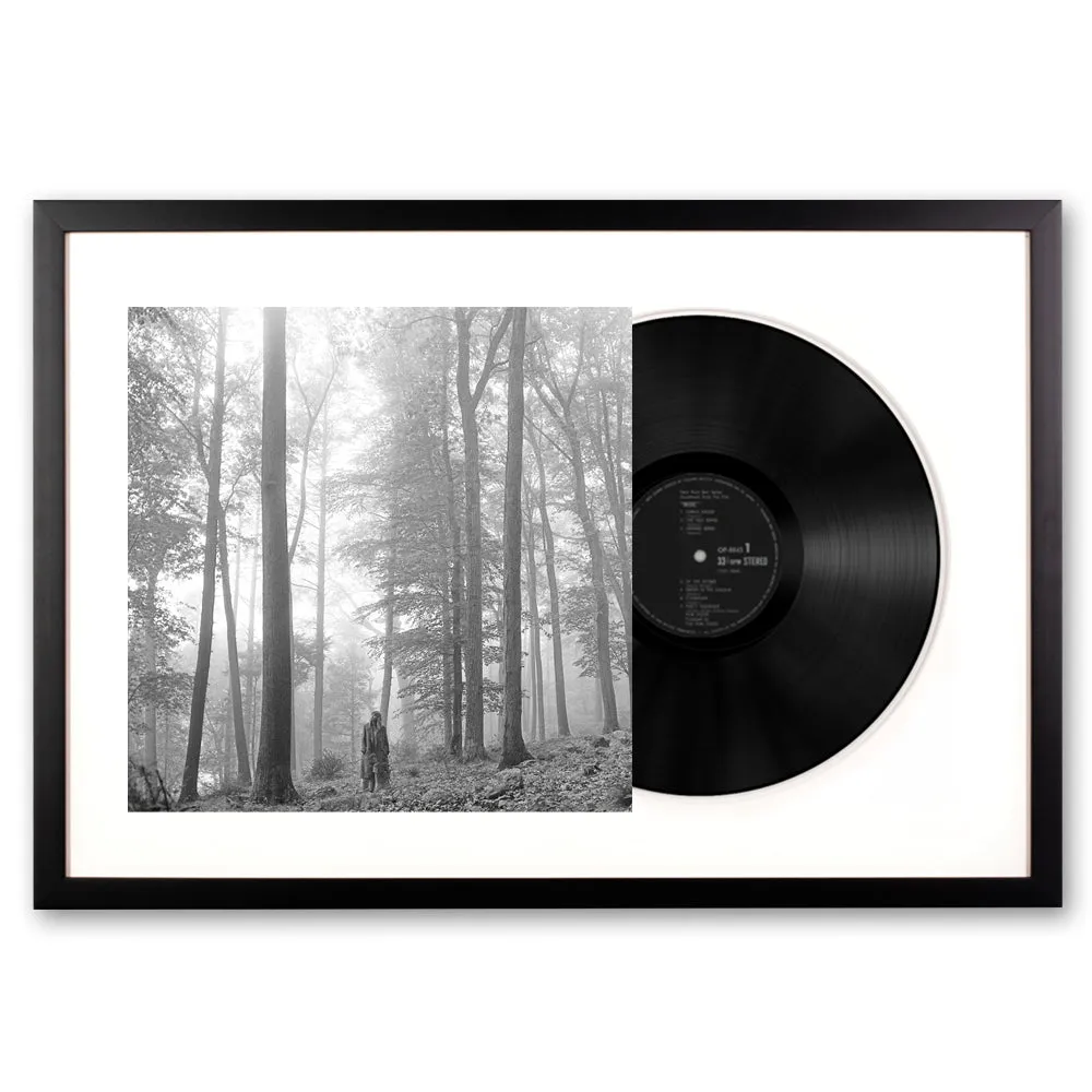 Framed Taylor Swift Folklore (In the Trees Edition) - Double Vinyl Album Art - We are eager to honour and showcase this art form by framing the actual original artist's vinyl cover and vinyl record themselves. This record is framed using all wood profiles, archival matting, and UV-filtering non-glare acrylic. The cover artwork is presented in full, while the actual vinyl peeks out of the sleeve. The outer dimensions of each frame are 75 cm x 47.5 cm.