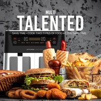 Kitchen Coutures Dual Draw 2 x 5 Litre Stainless Steel Air Fryer is the first of its kind featuring dual cooking zones, so you can cook with different functions at the same time and maximise on your cooking time. Designed with busy families and air fryer fanatics in mind, Kitchen Coutures Dual Draw 2 x 5 Litre Stainless Steel Air Fryer allows you to cook delicious and healthy food with one simple touch of a button and less oil than conventional methods. Air fry a crispy skinned salmon whilst roasting some crunchy greens, or dehydrate fruit snacks whilst making crunchy potato chips for dinner, with double the functions, youll halve your cooking time and double the convenience! Features: Brand: Kitchen Couture Type: Dual Draw Air Fryer Dual cooking chambers allow you to cook with different functions at the same time Viewing window and internal light so you can easily monitor food without opening the basket Rapid air circulation technology keeps food crispy on the outside and soft on the inside Requires little to no oil, unlike conventional cooking methods Six pre-programmed functions for fool-proof and delicious dinners and snacks Automatic timer shut o? so you can walk away without ruining dinner Detachable non-stick accessories for easy clean up LED display screen for easy use Large 10 Litre total capacity so you can cook for the whole family Wide temperature range 40 240 degrees Celsius to suit all types of recipes Specifications: Colour: Silver / Stainless steel Voltage: 240v / 60Hz Power: 1600W Tank Capacity: 2 x 5 Litres (10 Litres total) Colour: Silver / Stainless steel Functions: Air Fry / Max Crisp / Roast / Dehydrate/ Bake Dimensions: 37cm x 25.7cm x 31.5cm Weight: 10.2 kg Package Contents: 1 x Air Fryer
