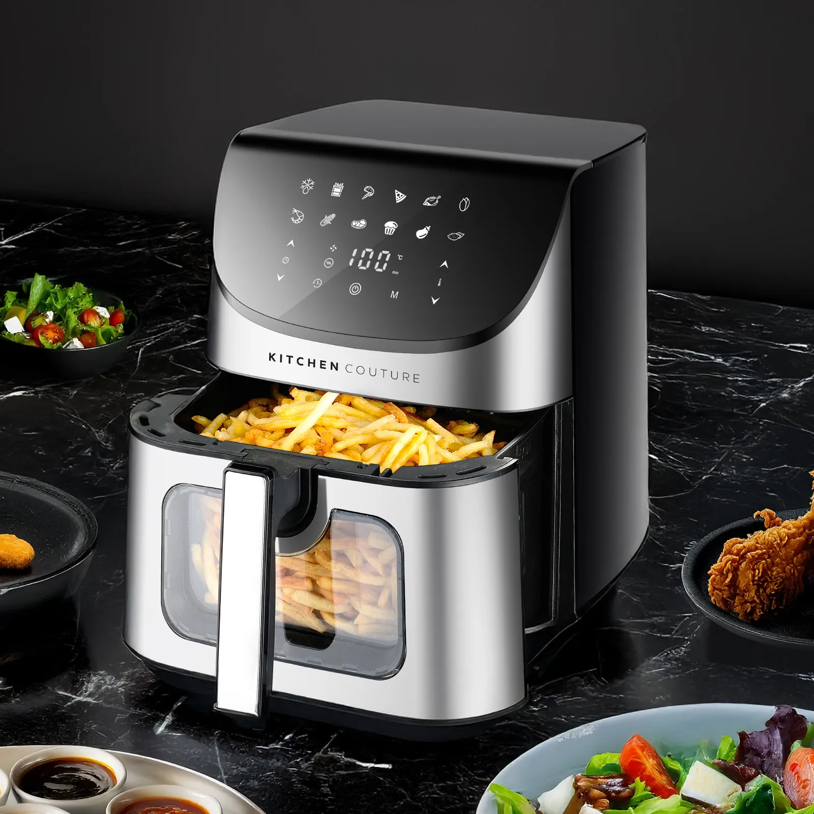 Introducing the Kitchen Couture 8 Litre Clearview Air Fryer, your new kitchen essential for healthier, delicious meals made effortlessly. The Kitchen Couture 8 Litre Digital Air Fryer is designed to seamlessly blend into your kitchen, offering a spacious 8 litre capacity to accommodate family sized meals with ease. With a wide temperature range from 80 degrees Celsius to 200 degrees Celsius, six carefully crafted on-board preset functions, and an adjustable 60-minute timer, youre quipped to achieve perfect results every time. For added convenience, the built-in clear view window allows you to monitor your dishes as they cook, ensuring they turn out just the way you like. Powered by 1700 watts, it ensures consistent cooking performance, whether you are air frying, roasting, or baking. The intuitive digital LED display, enhanced by user-friendly touch controls with vibrant easy to identify icons, makes selecting your preferred settings straightforward. Complemented by a base rack cooking tray, the Kitchen Couture 8 Litre Digital Air Fryer offers a refined approach to healthier, home-cooked meals, all wrapped in the timeless elegance of stainless steel. Features: Healthier, delicious meals made effortlessly: The Kitchen Couture 8 Litre Clearview Air Fryer is your ultimate kitchen essential, delivering guilt-free indulgence with every meal Family-sized capacity: Spacious 8-litre design effortlessly accommodates large meals, perfect for gatherings or everyday family use Customisable cooking precision: Features a wide temperature range (80 200 degrees Celsius), six preset functions, and a 60-minute adjustable timer for perfect results Convenient clear-view window: Built-in viewing panel lets you keep an eye on your dishes as they cook to perfection Powerful and efficient performance: 1700 watts of consistent power for air frying, roasting, or baking with ease Sleek and user-friendly design: Stainless steel finish, intuitive digital LED display, and easy-to-use touch controls with vibrant icons for straightforward operation Specifications: Brand: Kitchen Couture Type: Air Fryer Capacity: 8 Litre Colour: Silver, Black Power: 1700 W, 50/60 Hz, 220-240V Temperature: 80-200 degrees Celsius Timer: Up to 60 minutes Presets: 12 (Defrost, French fries, chicken wings, pizza, fish, nuts, shrimp, corn, steak, cake, vegetables, potatoes) Non-stick inner pot Easy to use touch panel SAA approved AU Plug Product Dimensions: 29cm (l) x 37cm (w) x 36cm (h) Weight: 7.2kg Package Contents: 1 x Air Fryer 1 x User Manual