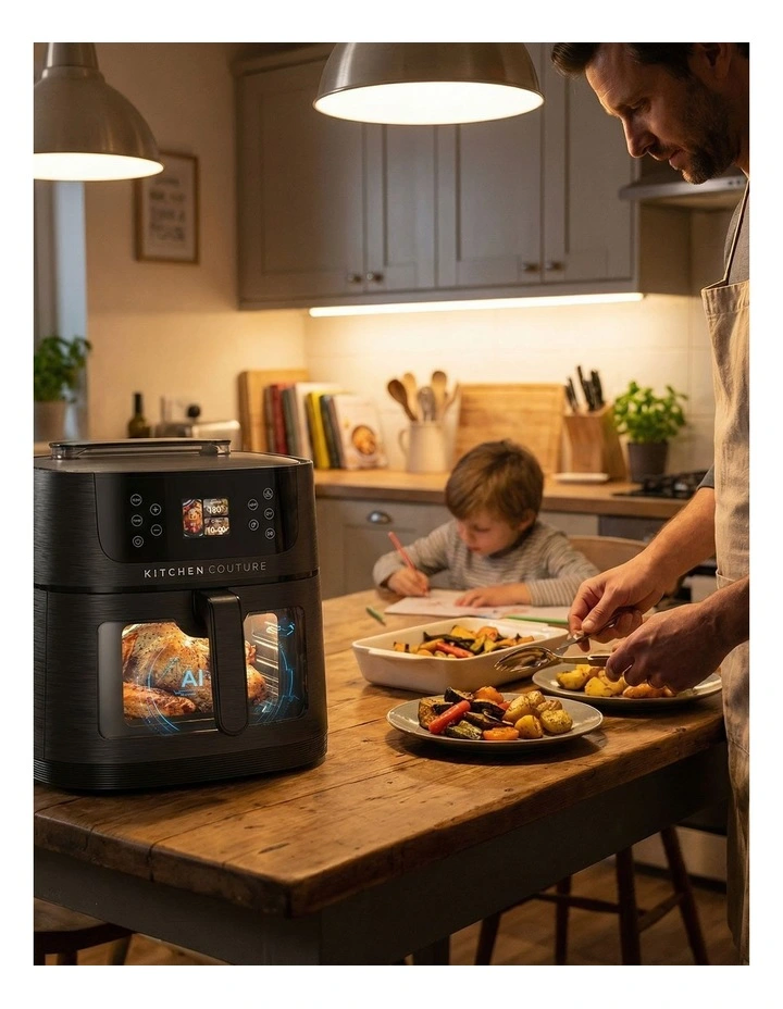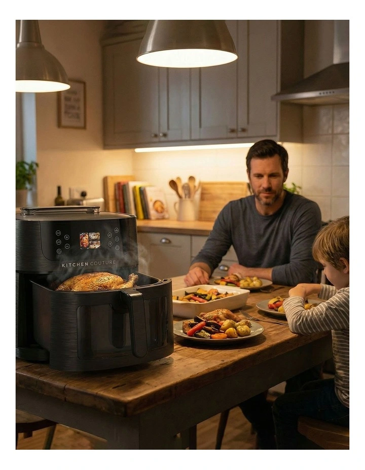 Kitchen Couture 8L Ai Smart Sense Steam Air Fryer smart sense digital air fryer. It thinks for you, so dinner's done for you. The generous 8L capacity makes it big enough to handle family meals, while the built-in steam box adds moisture when needed so your food stays extra succulent.