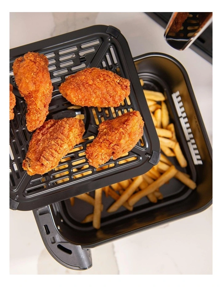 - Space-saving vertical design: say goodbye to bulky appliances cluttering your countertops. The stacked dual-drawer design makes the most of your kitchen space while still providing an impressive 11L total capacity. Whether you live in an apartment, have a compact kitchen, or just love an organised workspace, this sleek vertical fryer is the perfect solution