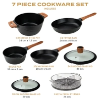Casserole Stew Pot - 24cm x 11cm - 3.9 Litres (1.13kg) Sauce Pan - 20cm x 8cm - 1.9 Litres (0.68kg) Fry Pan - 24cm x 5cm - 1.5 Litres (0.78kg) Fry Pan - 20cm x 4.6cm - 1.1 Litres (0.56kg) Steamer Basket - 24cm x 6.2cm (0.36kg) 20cm Lid- 20cm x 3.1cm (0.42kg) 24cm Lid- 24cm x 2.8cm (0.55kg) |