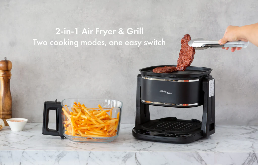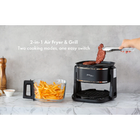 • Air Fry or Grill: Air fry with the 5L clear glass cooking basket, or flip the unit to grill steaks, seafood and vegetables. One appliance, two cooking styles.