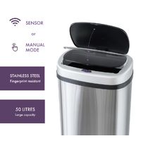 Upgrade your waste management with the 50L Motion Sensor Rubbish Bin. Featuring a hands-free auto-sensor lid, it opens with a simple wave and closes automatically for maximum hygiene. Built with a sleek, anti-fingerprint stainless steel body, this battery-operated bin also includes a low power alarm and optional manual mode for added convenience. Perfect for modern kitchens and busy households.