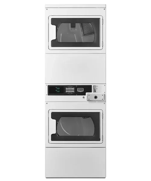 Double your drying capacity and cut back on wait times with Maytag Commercials MLE/G27PD coin or card 10.5kg stack dryer/dryer that combines 2 x 10.5kg drying pockets in the floor space of just 1!
