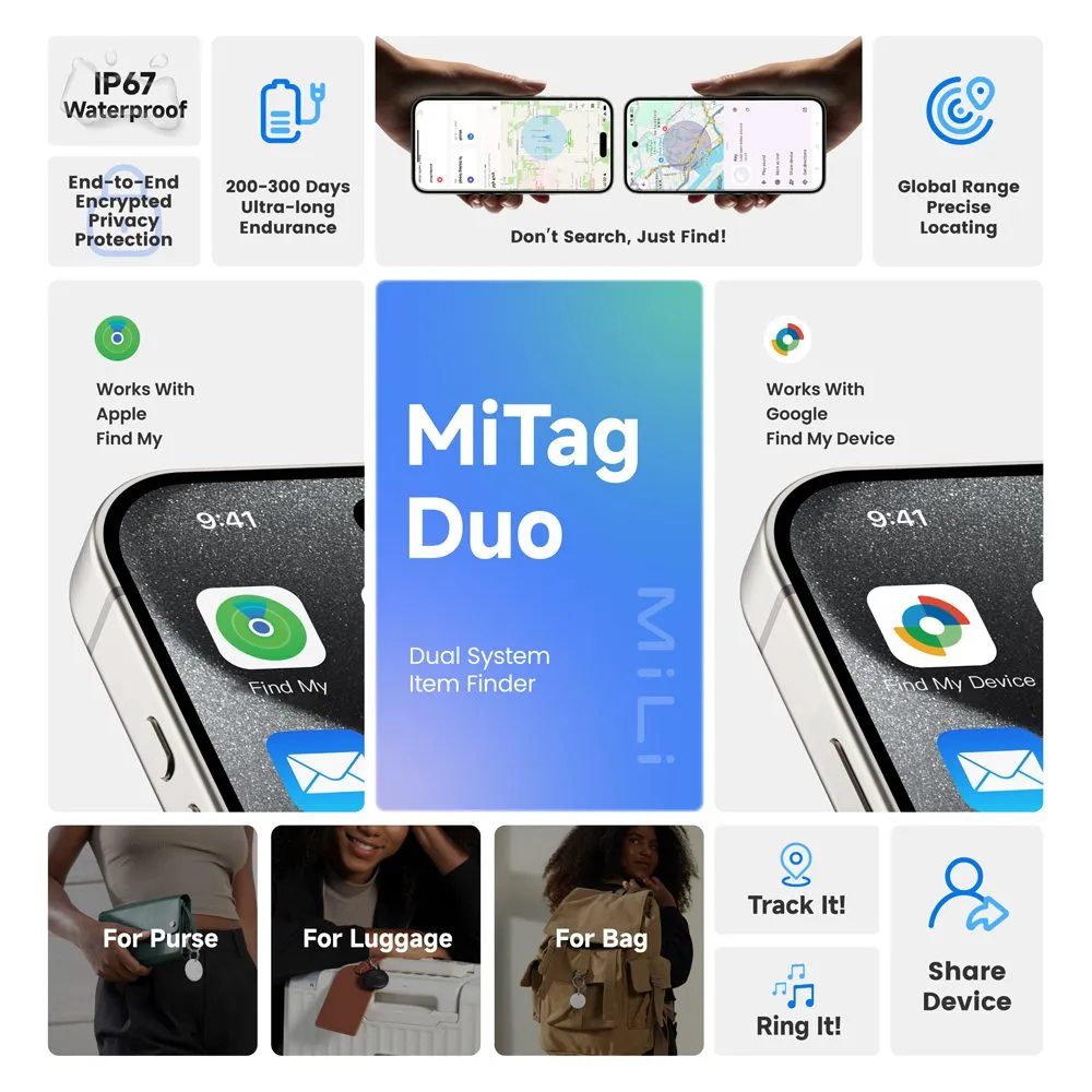 No matter your device, MiTag Duo ensures smooth cross-platform tracking with full iOS or Android support. And it’s not just a tracker, it’s your quiet companion in the chaos, your invisible safety net when things don’t go as planned. With MiTag, you move not with uncertainty, but with calm assurance. Every step becomes simpler, every journey more enjoyable, because you know—your valuables are just where they should be.