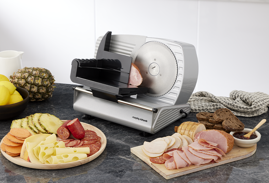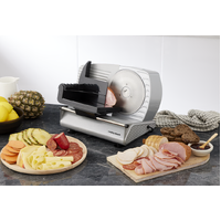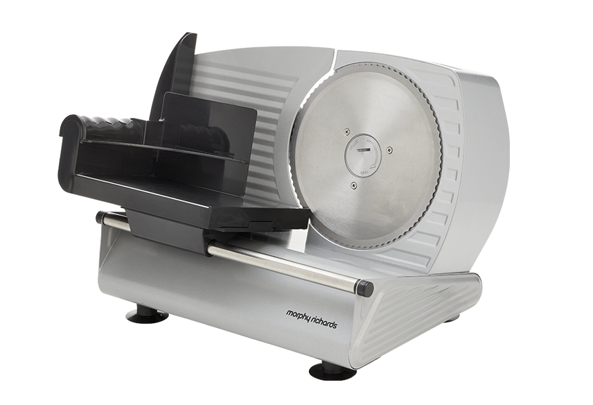 Effortlessly slice through meats, cheeses, fruits, vegetables, and bread with precision using the Morphy Richards Electric Food Slicer. Featuring a powerful 200W DC motor, durable 190mm stainless steel serrated blade, adjustable slicing dial and enhanced safety features like a blade guard and non-slip feet, all housed in a robust metal frame.