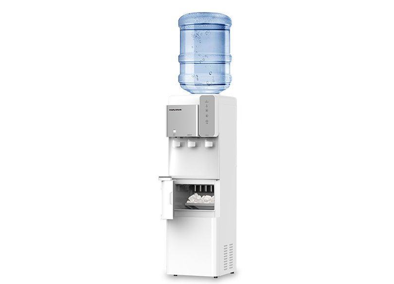 This top-loading unit (compatible with 11L, 15L, and 18L water bottles) features stainless steel tanks and delivers hot (90–95°C), cold (5–10°C), and ambient water. The built-in ice maker produces 9 bullet-shaped ice cubes every 8–9 minutes - up to 13kg per day, stored in a 1.4kg bin. Includes touch control panel & warning indicators, and a child safety dispenser lock for the hot water tap.