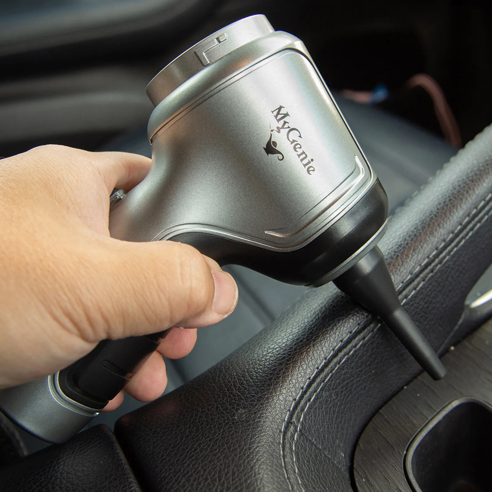 Experience powerful 2-in-1 performance with the MyGenie Tornado Mini Car Vacuum and Blower: This compact mini vacuum and blower combines the functionality of a vacuum cleaner and a blower in one, compact package. With its high-powered brushless motor, it effortlessly sucks up dirt, crumbs, and debris from every nook and cranny of your cars interior. Plus, using the reverse direction, the blower function makes drying wet surfaces or dusting your interior a breeze by blasting away stubborn dirt with ease. Being fully cordless and charged by USB, there is no more being tethered to a power outlet! The MyGenie Tornado Mini Car Vacuum and Blower operates anywhere, giving you the freedom to clean your vehicle, caravan, kitchen, desk anywhere at any time. Whether youre at home, on the road or out exploring, you can clean up rapidly without any limitations. Charge in the car via a 12V USB charger (not included) or via another USB socket, while at home or on the go, this handy device is as easy to charge as it is to use. Equipped with a variety of attachments, this 2-in-1 vacuum blower ensures through and precise cleaning. Reach every corner, upholstery crease, and floor mat with ease. We have every tool for every situation. MyGenie Tornado Mini Car Vacuum and Blower isnt just for cars! Use it to tackle messes in your home, RV, boat, or workshop. From carpets to curtains, this versatile tool has got you covered. Features: Brand: MyGenie USB-C Charging Cyclone Vacuum Dual Use: Vacuum and air blower (Duster) Low Noise Operation Spare Filter Included HEPA Filter Reusable and washable Vac, blow and dust Motor Design: Brushless Ultra high efficiency Colour: Black, Grey Product Dimensions: 16.5cm x 14cm x 9cm Weight: 300 grams Cleaning Characteristics: Suction Power (max): 9500pa Dustbin Capacity: 400ml Filter: HEPA Washable Recharge: via USB in car or home (cable included) Run Time (Max): Up to 40 minutes Tools: 7 x Interchangeable heads Case: Hard case included Package Contents: 1 x Vacuum 1 x Hard Case 1 x Spare Filter 7 x Attachments 1 x USB-C to USB A Cable