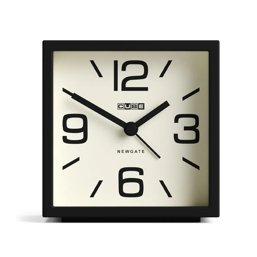 Newgate Cube Mantel Clock-Black - The Newgate Cube Alarm Clock is a compact, stylish timepiece that blends bold retro character with modern simplicity. Designed with a square case, crisp numerals and a clean, minimalist dial, it adds a subtle mid-century modern touch to any bedside table or desk. Its small footprint makes it ideal for spaces where style and practicality go hand in hand, while the clear clock face ensures easy readability at a glance.