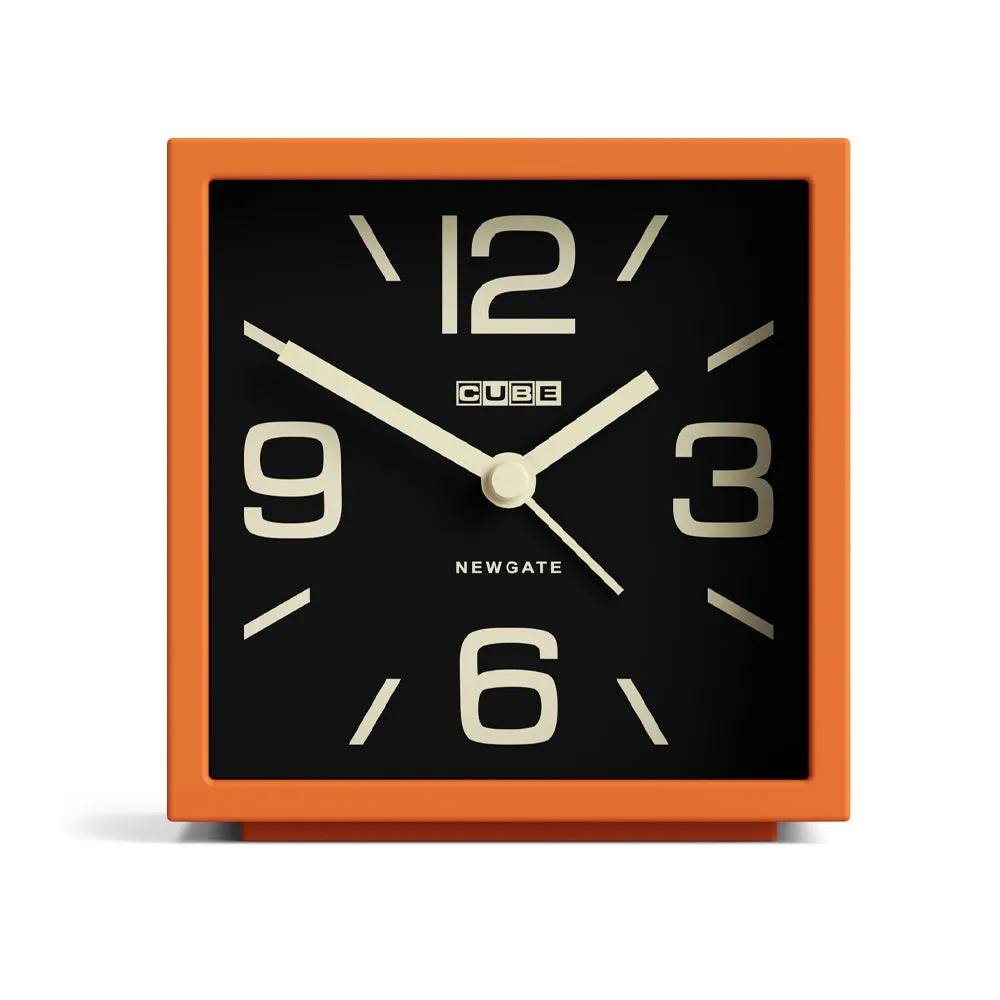 Newgate Cube Mantel Clock-Pumpkin Orange - The Newgate Cube Alarm Clock is a compact, stylish timepiece that blends bold retro character with modern simplicity. Designed with a square case, crisp numerals and a clean, minimalist dial, it adds a subtle mid-century modern touch to any bedside table or desk. Its small footprint makes it ideal for spaces where style and practicality go hand in hand, while the clear clock face ensures easy readability at a glance.