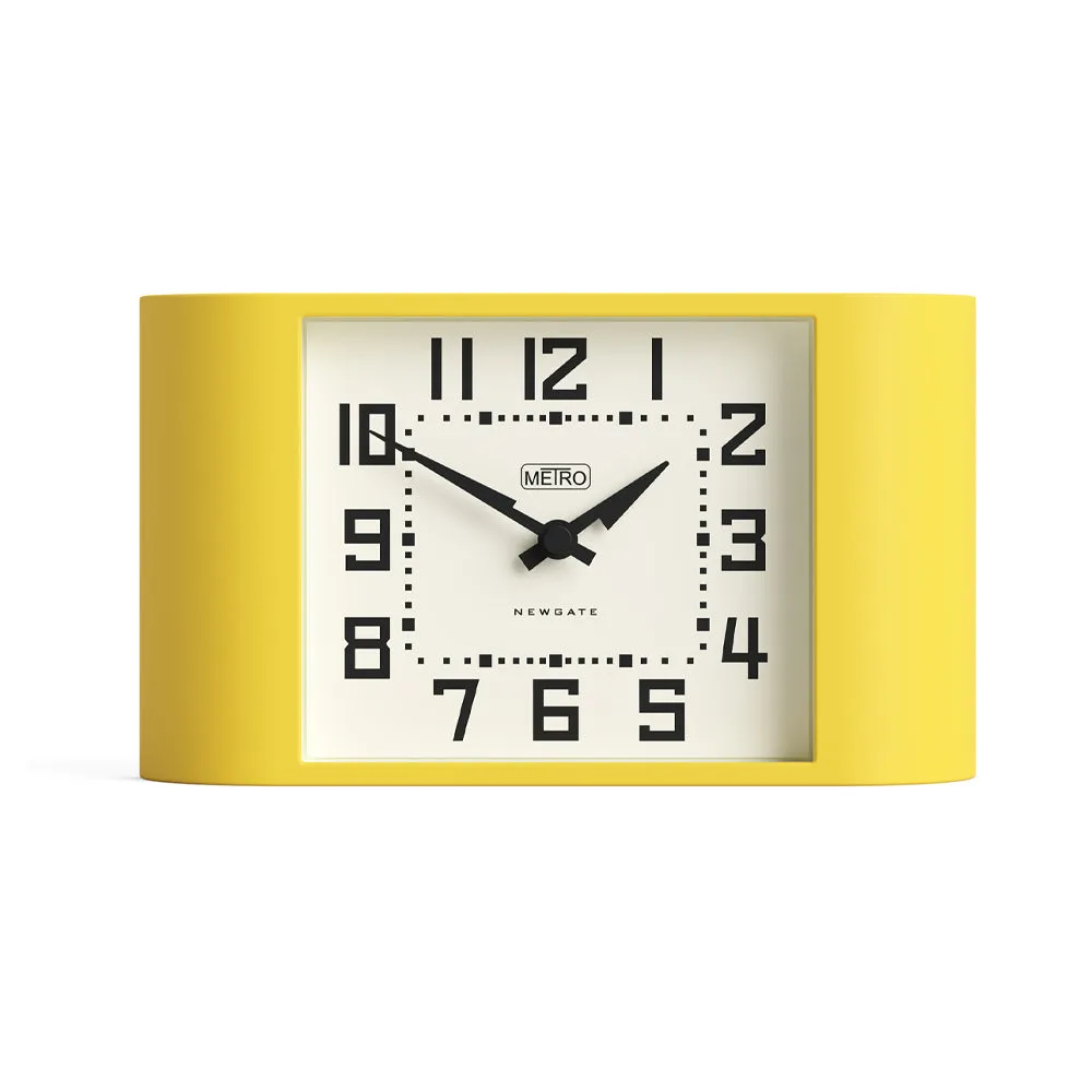 Newgate Mini Metro Mantel Clock-Yellow - The Newgate Mini Metro mantel clock offers a refined, compact interpretation of the iconic Metro design. Blending retro character with a clean, contemporary look, it features a softly curved rectangular case, bold numerals, and a pared-back dial. Ideal for shelves, bedside tables, or desks, this smaller mantel clock delivers timeless style in a practical, space-saving form.