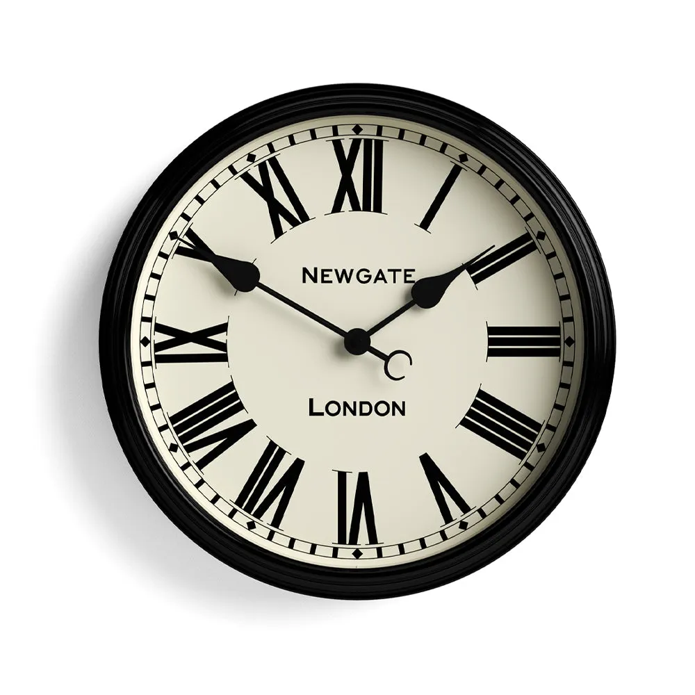Newgate Spitalfields Wall Clock-Black - A timeless Newgate design, the Spitalfields wall clock features a sleek metal case with a high-gloss black finish. The classic Roman numeral dial is protected by a clear glass lens and complemented by refined metal hands, making it a stylish statement piece for any interior.