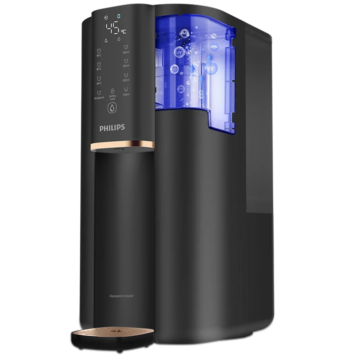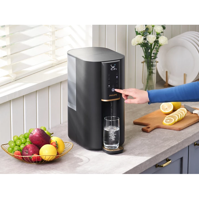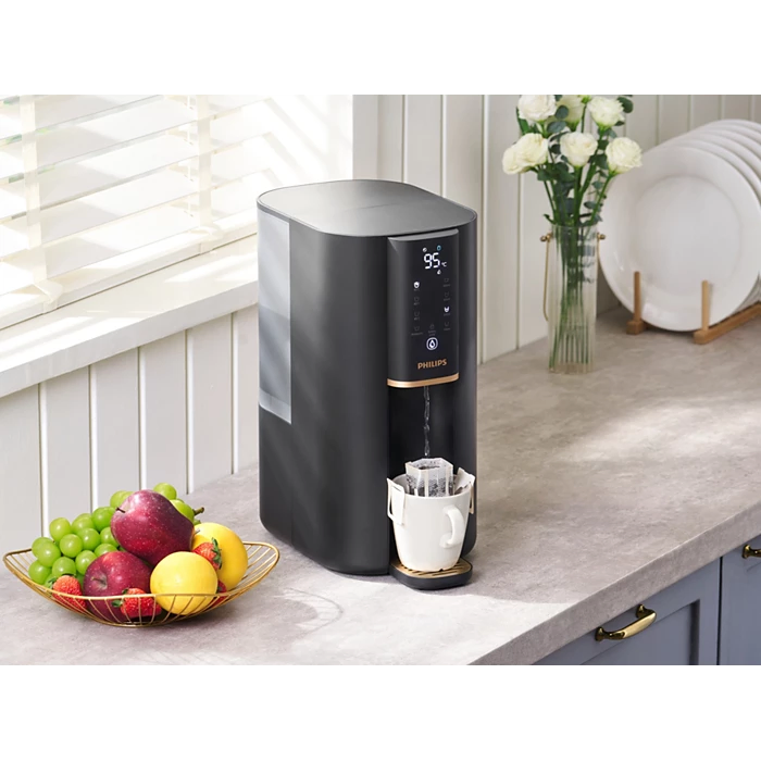 Thanks to instant heating technology, freshly purified hot water is dispensed within seconds.